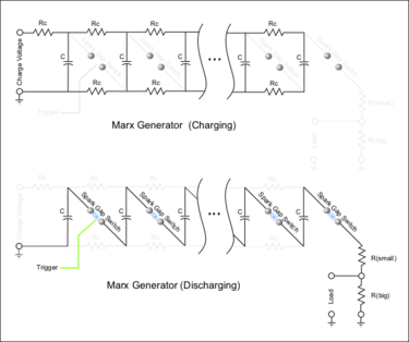 A Marx generator is a type of electrical circuit whose purpose is to generate a high-voltage pulse by a number of capacitors that are charged in parallel and then connected in series by spark gap switches.